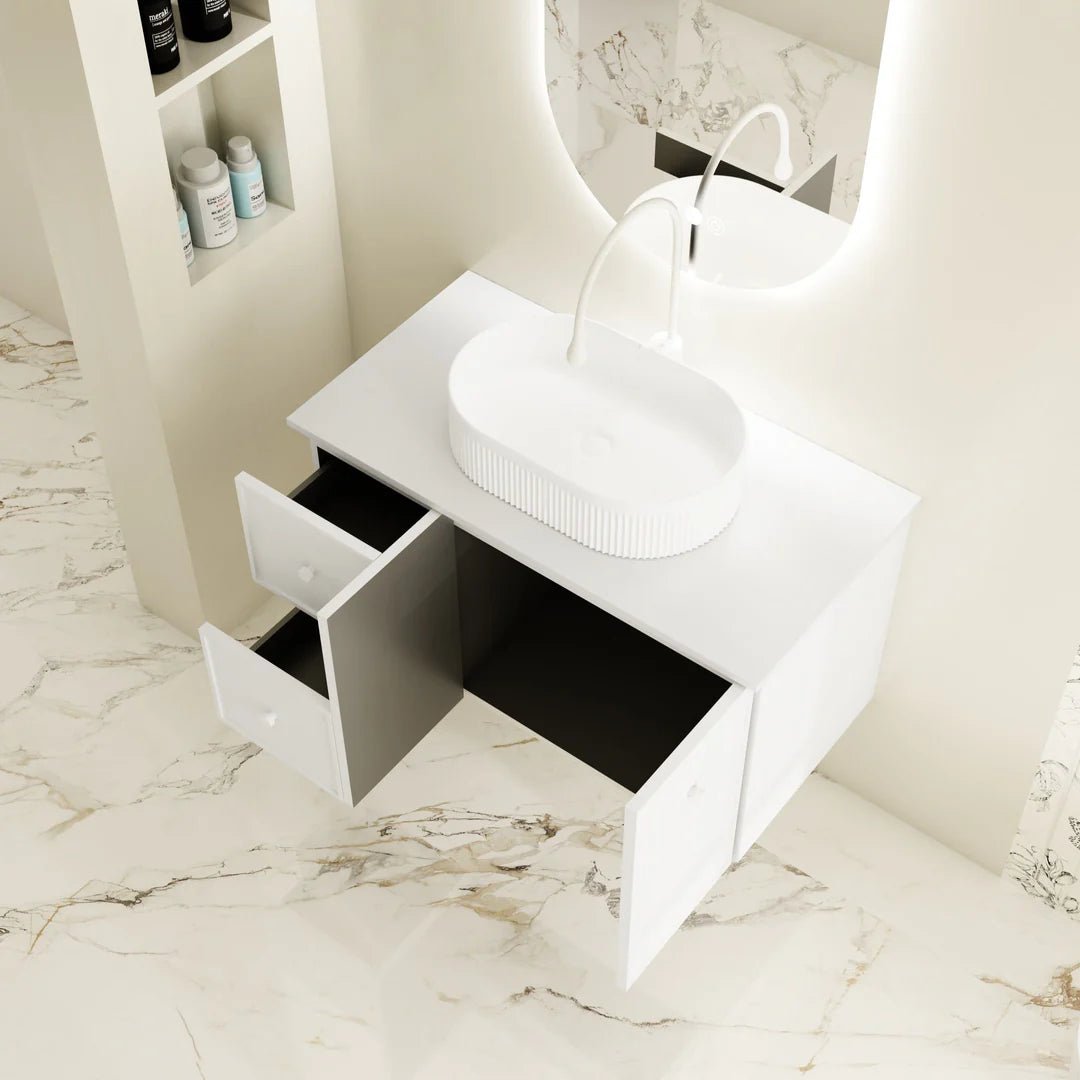 Balancing generous storage with refined proportions, the Seattle 900mm Wall-Hung Vanity is a timeless addition to contemporary bathrooms. Finished in soft matt white and available with two stylish handle options, it offers practical storage with clean lines and a floating form that enhances spatial elegance.