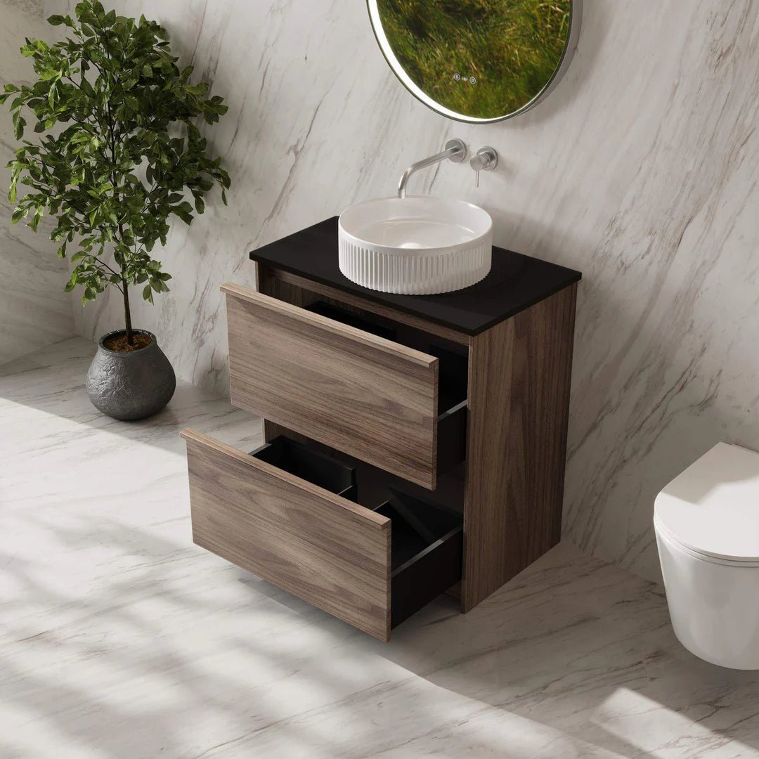 Supports single or double cabinet basins, or optional stone top (Luna White, Black, or Carrara White) with countertop basin combinations.